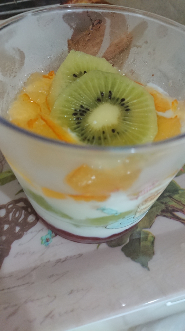 家にあったキウイを刻み イチゴ・マーマレードのソース・ヨーグルトを層にしてスイーツとして一緒に食しました(^-^)