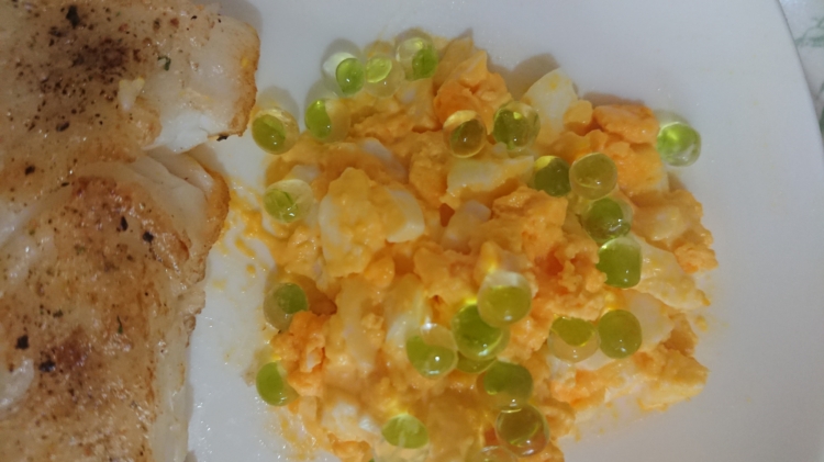 白身魚のムニエルを作って その組み合わせとして茹で卵を刻みマヨネーズを和えたものに+としてわさビーズを添えました