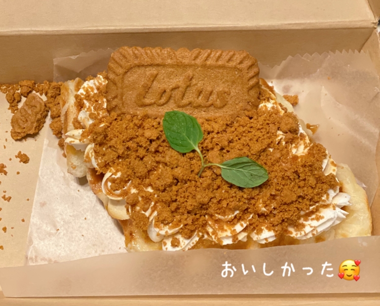 ワッフルの上にクリームと砕いたロータスビスケットが乗っていてボリュームたっぷり幸せがいっぱいの味でした😆